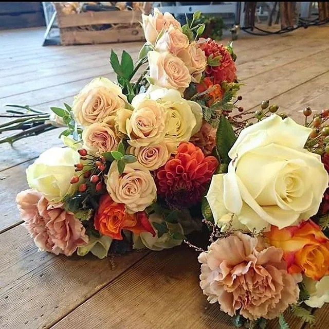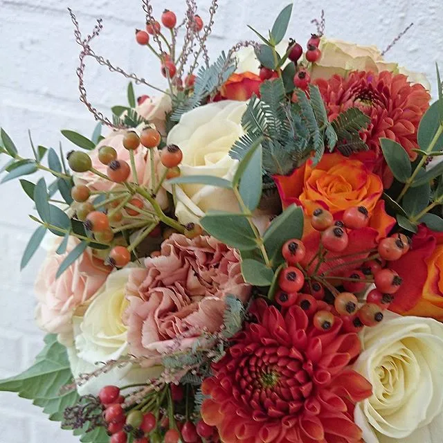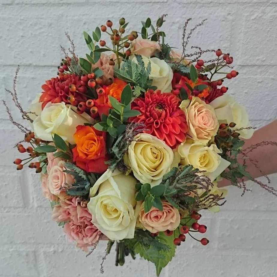 Underbar brudbukett i creamvitt,rött,orange,grönt.