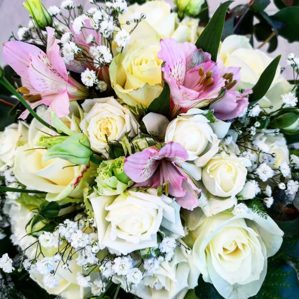 Vacker brudbukett i vitt med inslag av rosa Med vita avalanchrosor,vit kvistros, ecalyptus, rosa alstromeria,brudslöja mm Finns matchande tärnbukett under kategori ”Tärnbukett”