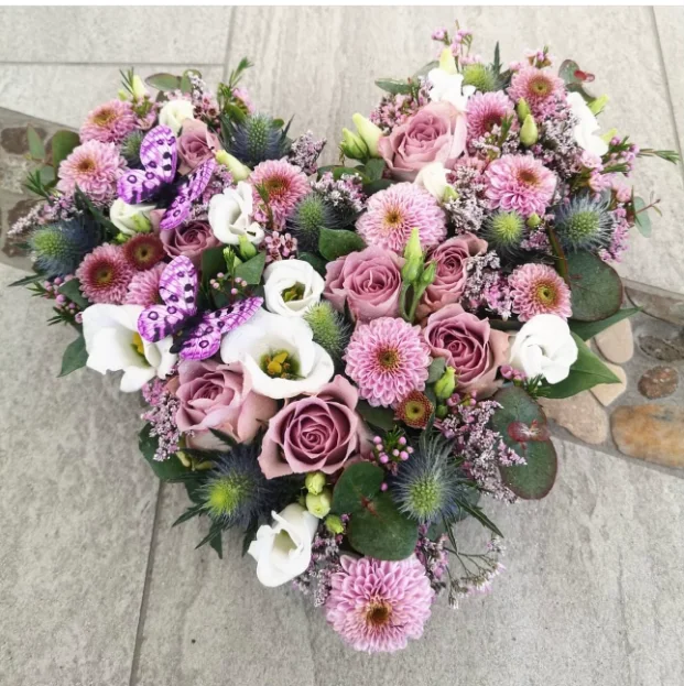 Litet oasishjärta i ljuslila och vita toner, hjärtat är ca 28cm dekorerad.