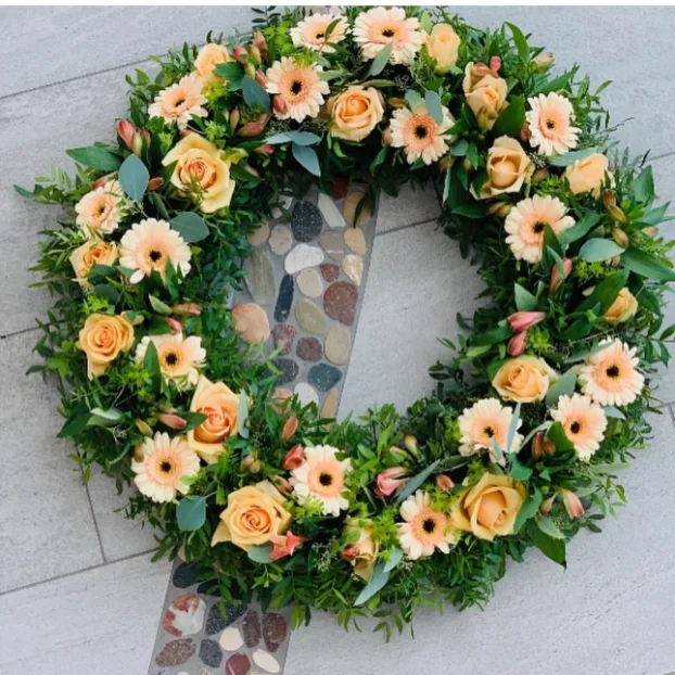 Vacker maffig rundbunden krans i aprikos och creme färger tillsammans med olika grönt. Kransen är ca 65cm dekorerad
