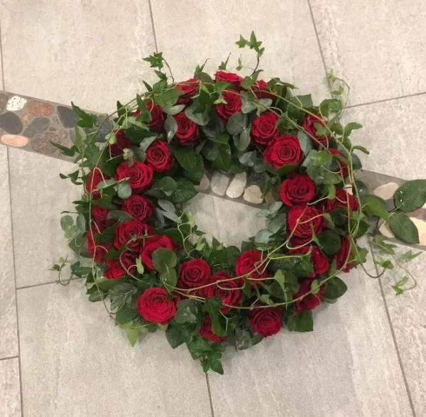 Oasiskrans med röda rosor och murgröna, kransen är ca 40cm dekorerad