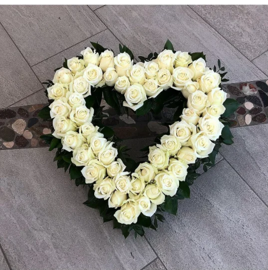 Stilfullt öppet hjärta i vitt, hjärtat är ca 45 cm dekorerad och innehåller 55st rosor.