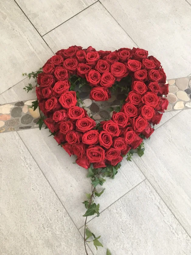 Stort hjärta med röda rosor, går att binda till lägre pris med färre rosor.