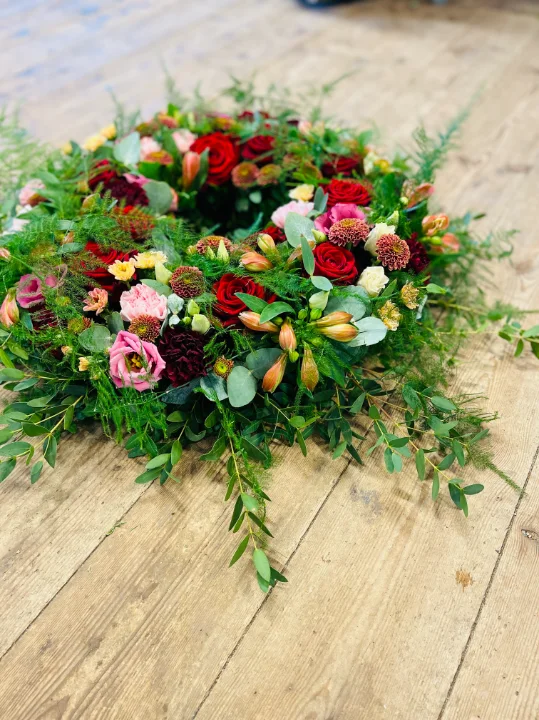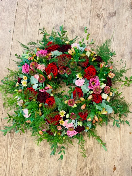 Rundbunden krans i rosa och röd/vinröda toner. Binds med blommor efter säsong.