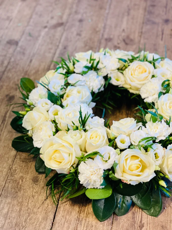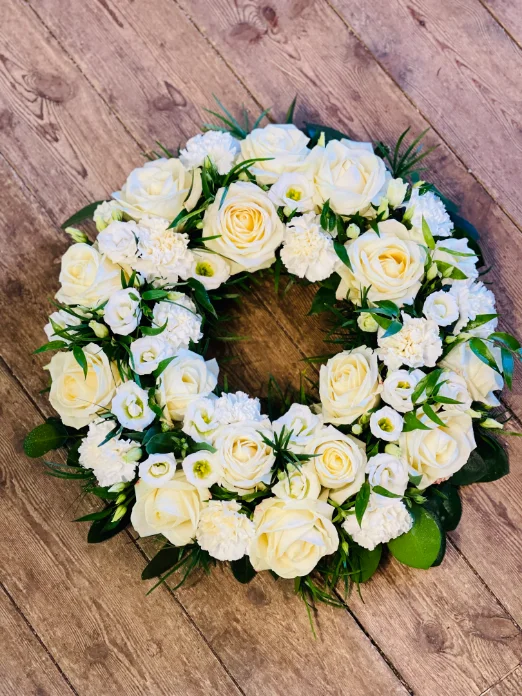 Vacker rundbunden krans i vita toner med rosor, nejlikor och prärieklocka tillsammans med vackert grönt. Kransen är ca 40 cm i diameter.