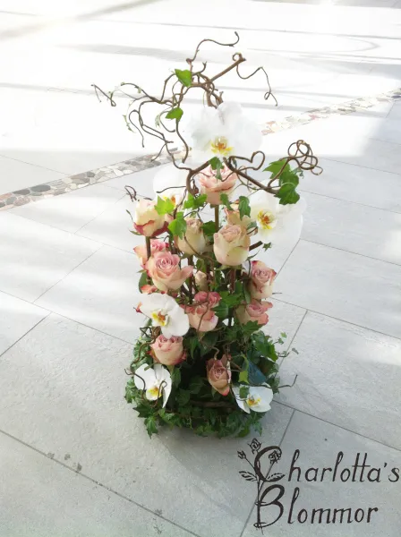 Sorgdekoration hög med rosor,trollhassel,orkidéklockor o murgröna.